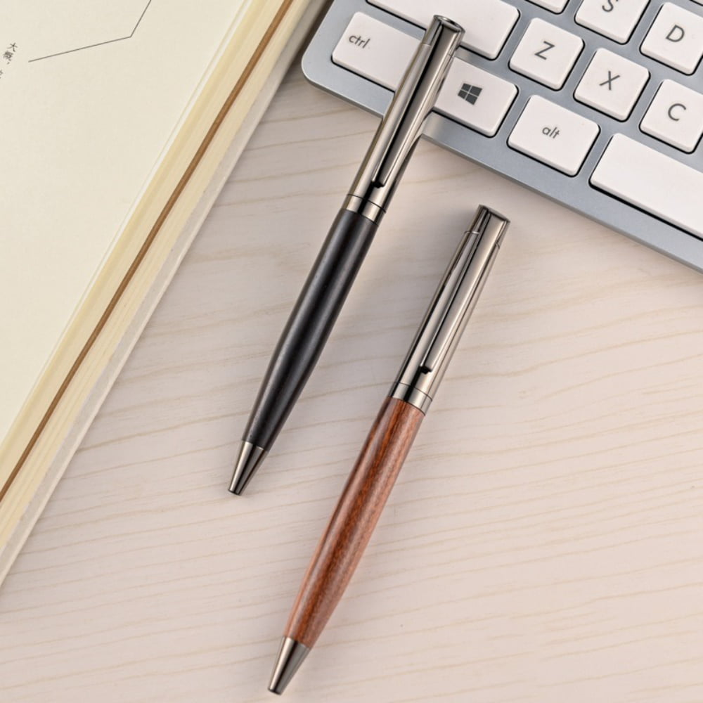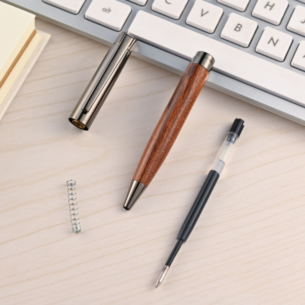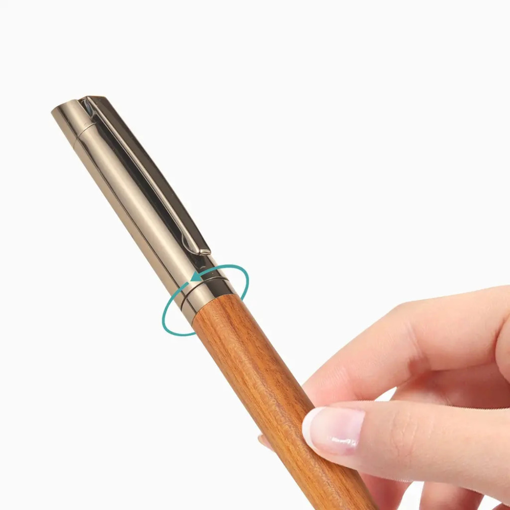 This metal pen combines a polished wooden barrel with sleek metallic accents, creating a professional, elegant look. Featuring a twist cap, retractable medium-point tip, and refillable system, it provides smooth, reliable writing for office, personal, or executive use. You can also opt for a pen with stylus tip for modern digital needs, making it versatile and functional.