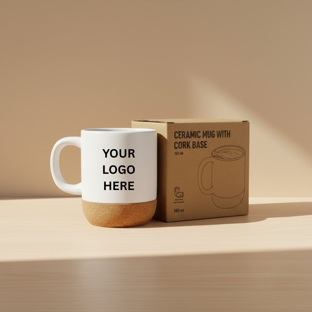 A ceramic cup with cork bottom is a durable mug made from ceramic with a natural cork base. The cork protects surfaces from heat, prevents slipping, and adds an eco-friendly, modern look, making it a popular choice for daily use and corporate gifts.