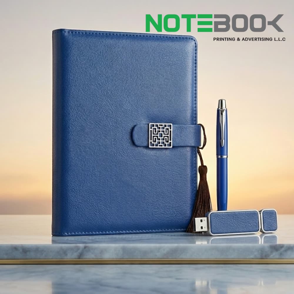 Looking for customized corporate gifts in Sharjah that are practical, premium, and brand-focused? Notebook Advertising LLC, a trusted corporate gifting company serving the UAE, presents an elegant Blue Corporate Gift Set featuring a notebook, pen, and USB flash drive — designed for modern businesses in Sharjah.