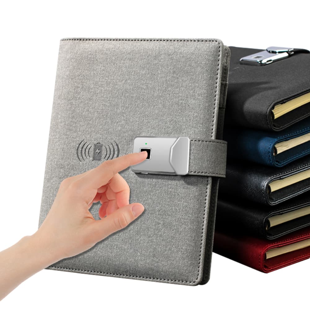 Crafted with premium PU leather, the hardcover notebook includes a 10,000 mAh built-in power bank and wireless charging capabilities, ensuring your devices stay powered throughout the day. The innovative fingerprint lock provides advanced security, giving you peace of mind while keeping your personal notes, business information, and confidential data safe.