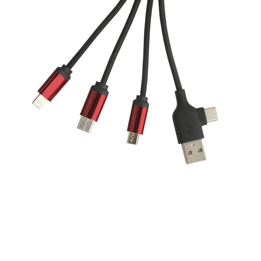 This 4-in-1 USB charging cable features a USB-A input with three output connectors: