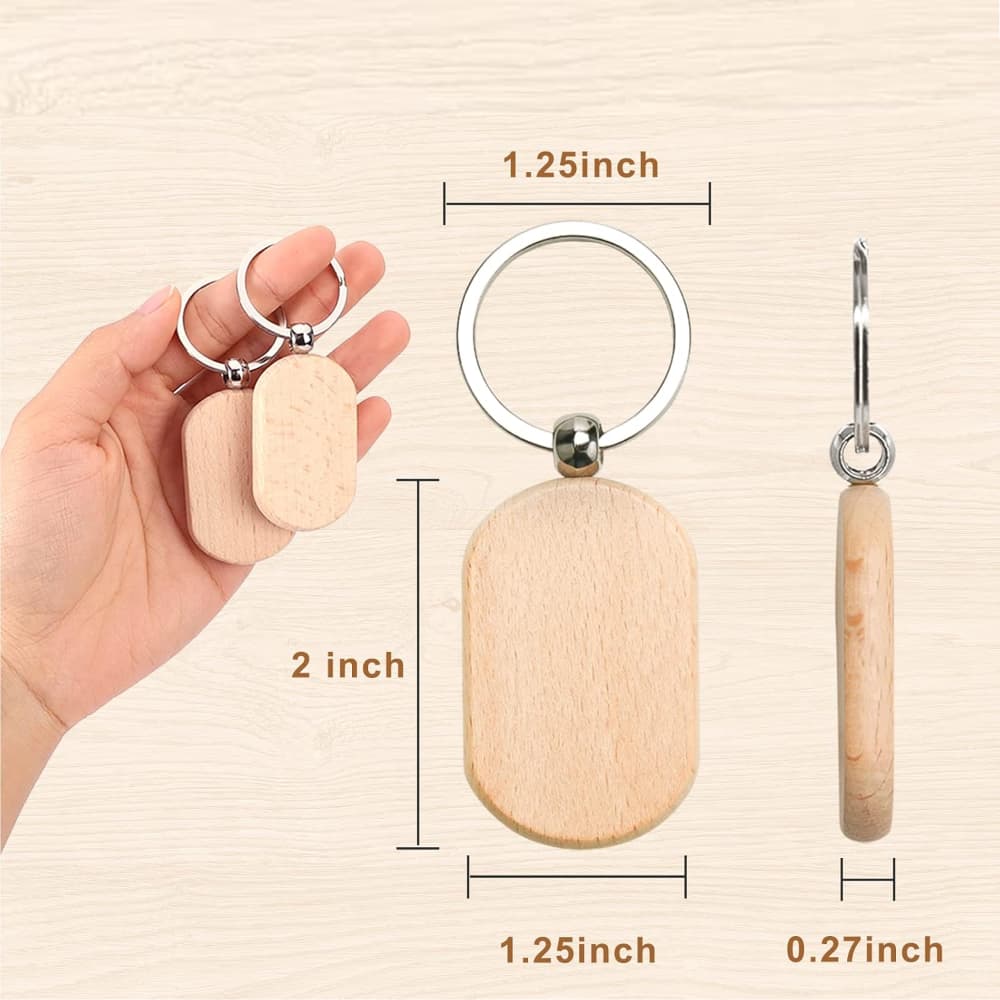 A personalized oval wooden keyring is a custom wooden keychain made from natural beech wood, branded with a logo using laser engraving or keychain printing.