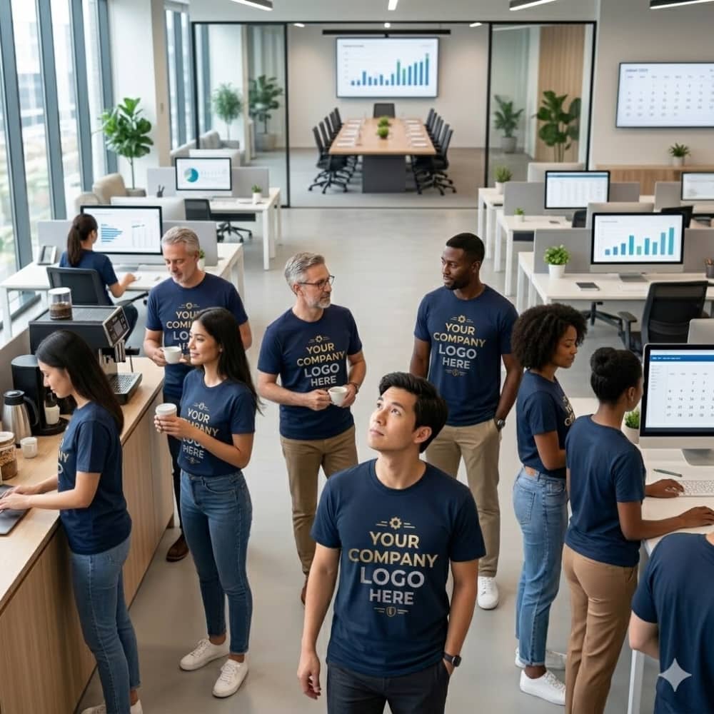 Notebook Advertising LLC prints T-shirts in bulk starting from 10 pieces, ideal for staff uniforms, corporate events, or promotional giveaways. [Request a quote today]