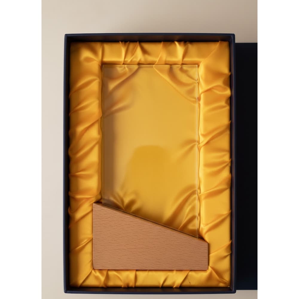 The rectangular crystal design provides a clean, modern surface that enhances engraving clarity, while the wooden base adds stability and a natural, premium finish.