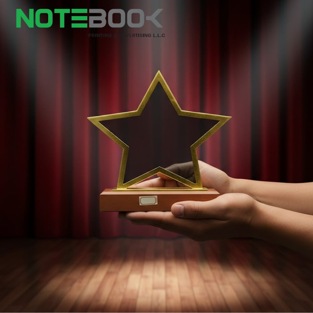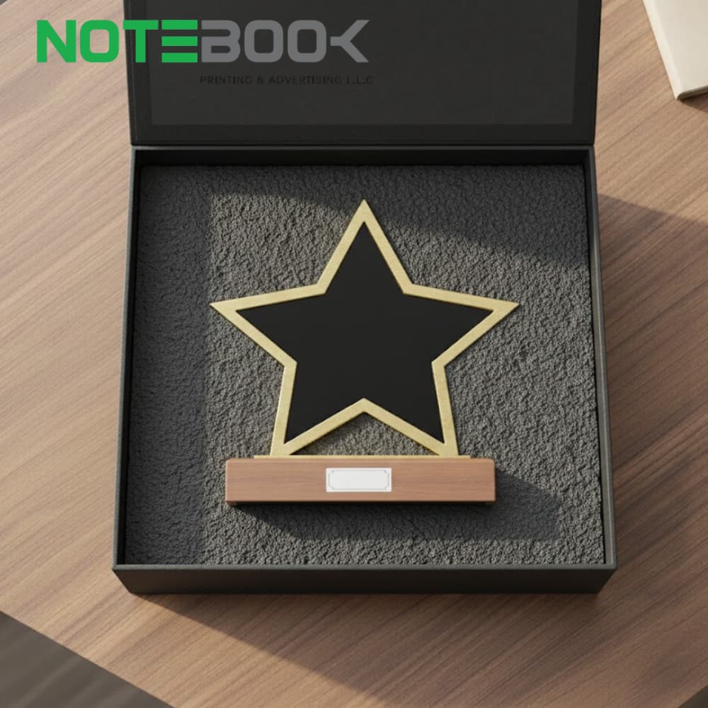 Celebrate achievement in style with the Star Shaped Crystal Award with Wooden Base from Notebook Advertising LLC, a leading corporate award supplier in Dubai. This gold-colored star trophy is perfect for employee recognition, corporate milestones, client appreciation, and award ceremonies, combining elegance, durability, and professional customization to make every achievement memorable.