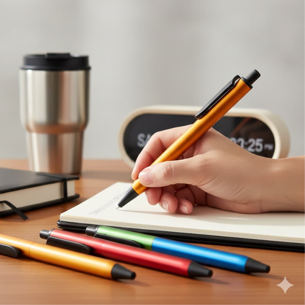 Available in green, rose gold, orange, white, maroon, pink, blue, and dark gray, these pens are a vibrant addition to your corporate giveaways, promotional events, and branding campaigns. Its ergonomic design ensures comfortable writing, while the durable clip lets users attach it to notebooks, binders, or pockets, keeping your brand visible throughout daily use.