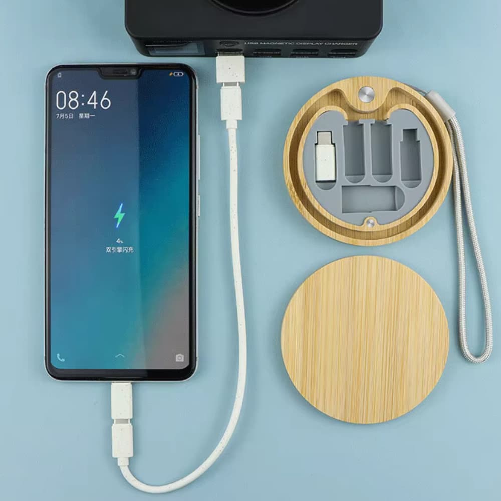 Housed in a durable, biodegradable round bamboo case, this charging set reflects your commitment to sustainability. Bamboo is a renewable and environmentally friendly material, providing a green alternative to traditional plastic tech accessories. The case keeps cables protected, organized, and tangle-free while adding a sophisticated touch to any workspace.